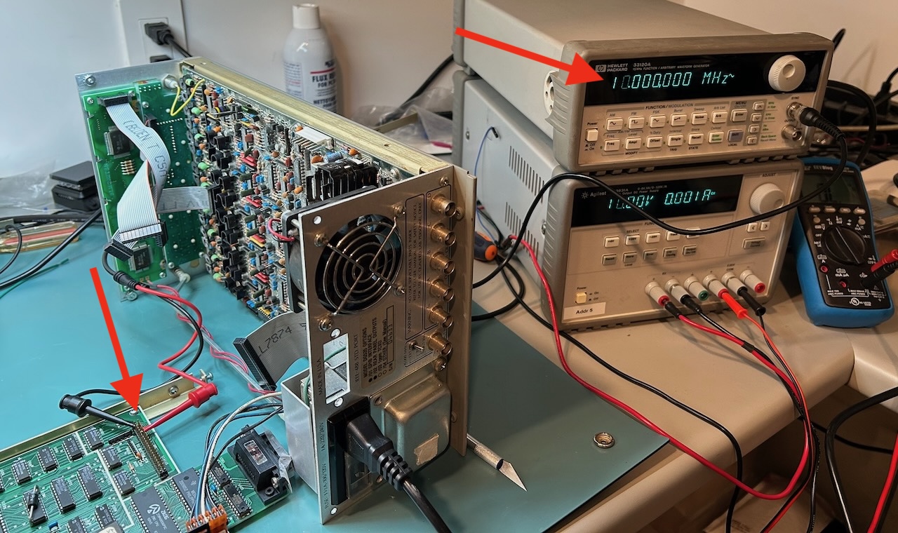 In the picture above, in addition to the signal generator, you can also see an HP 3631A power supply that outputs 10V: this is a replacement of the reference voltage that’s needed for the dying gasp and reset generator that I mentioned earlier. These are the 2 external signals that are needed to run the CPU top PCB without the analog bottom PCB, though only for a short time: without current boost resistor, the 7805 was now taking on all the current and warming up.