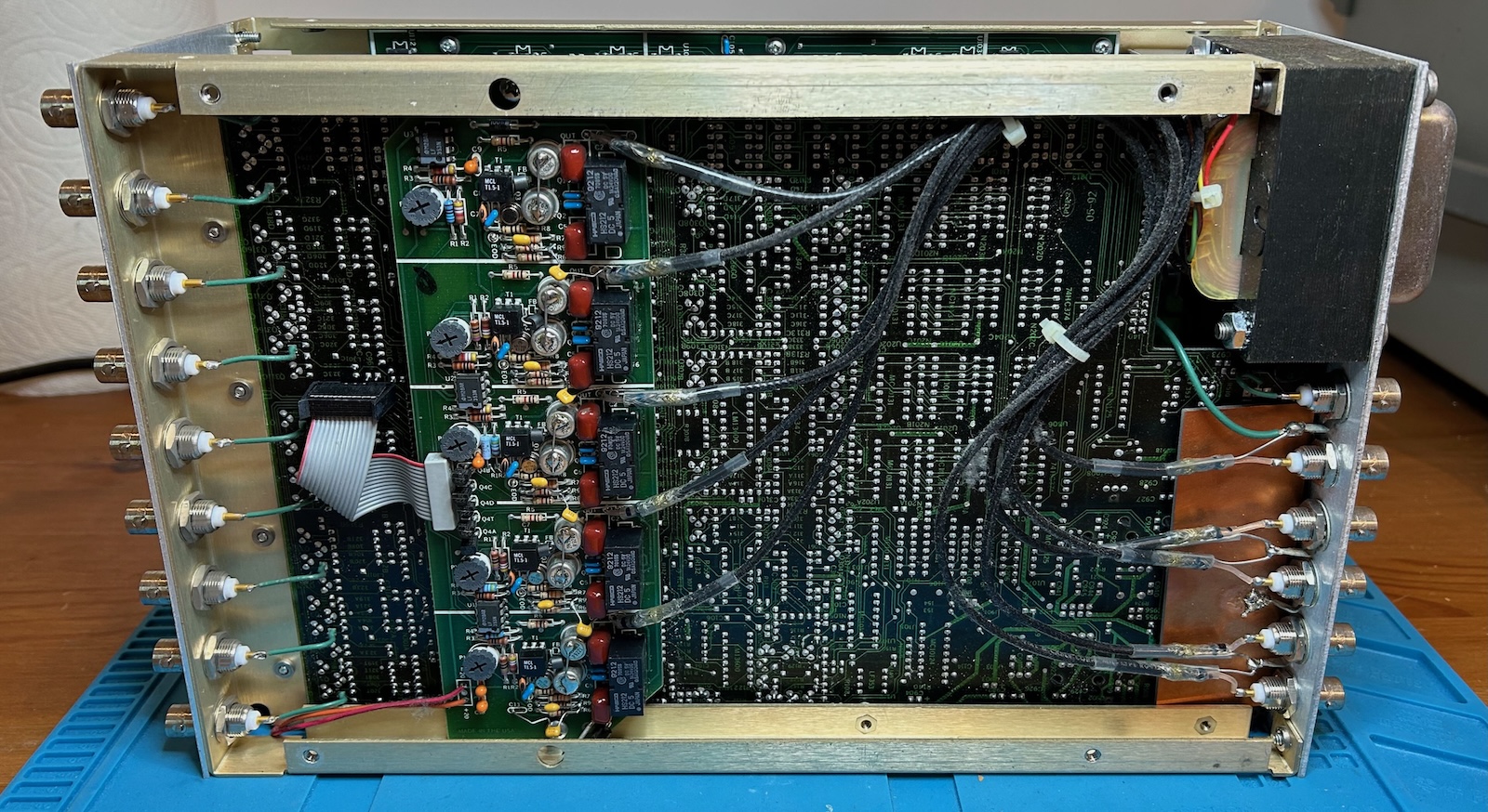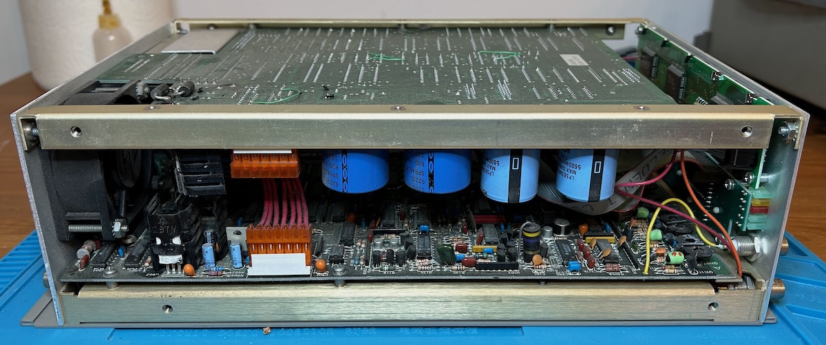 There is also a connector and a switch to select either the internal or an external 10 MHz timebase. Missing screws around the transformer housing are an indication that I’m not the first one who has been inside to repair the unit.