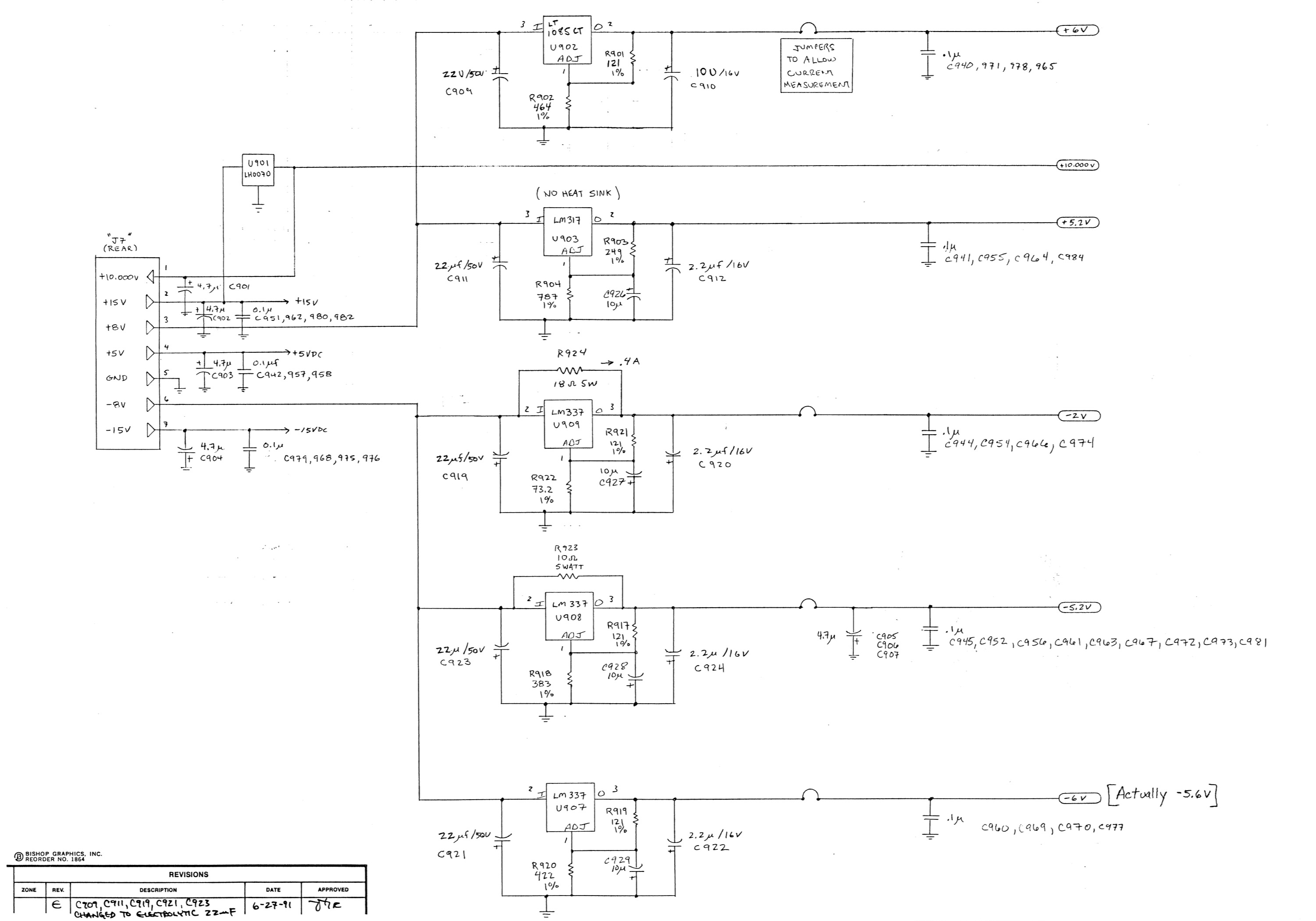More linear regulators, 2 on the unregulated +8V (?) rail to create +6V and +5.2V, and 3 on the unregulated -8V rail to create -2V, -5.2V, and -6V (“actually -5.6V”).
