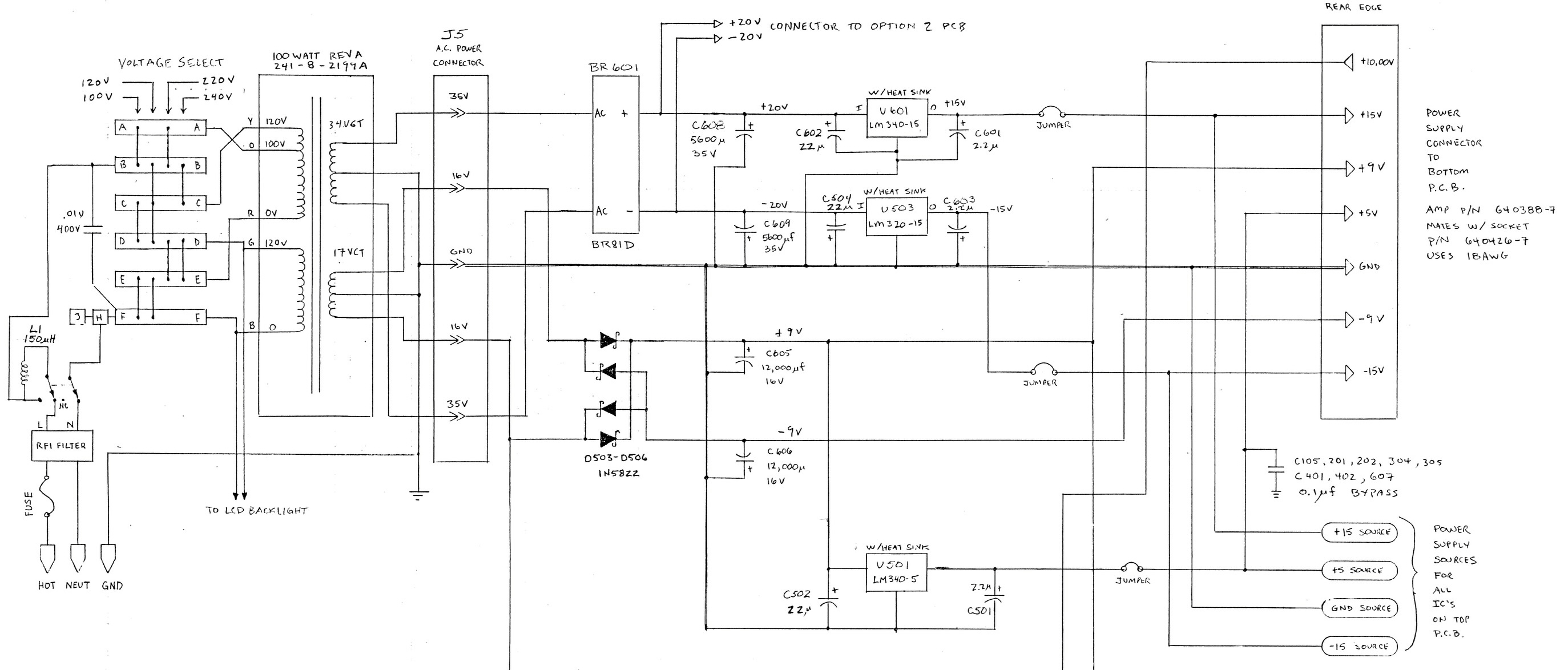 - The schematic in the manual shows a discrete diode full bridge for the unregulated +/-9V rail, instead of an integrated one, and no current boost resistor.