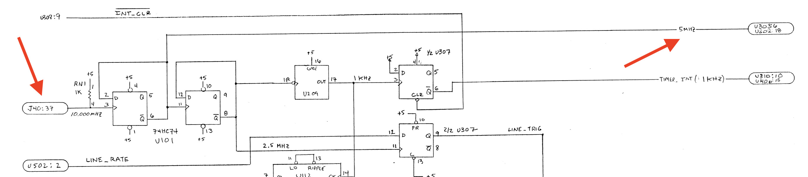 To run the CPU board stand-alone with an active clock, I configured my HP 33120A signal generator to generate a 10 MHz signal and routed its SYNC to connector J40.